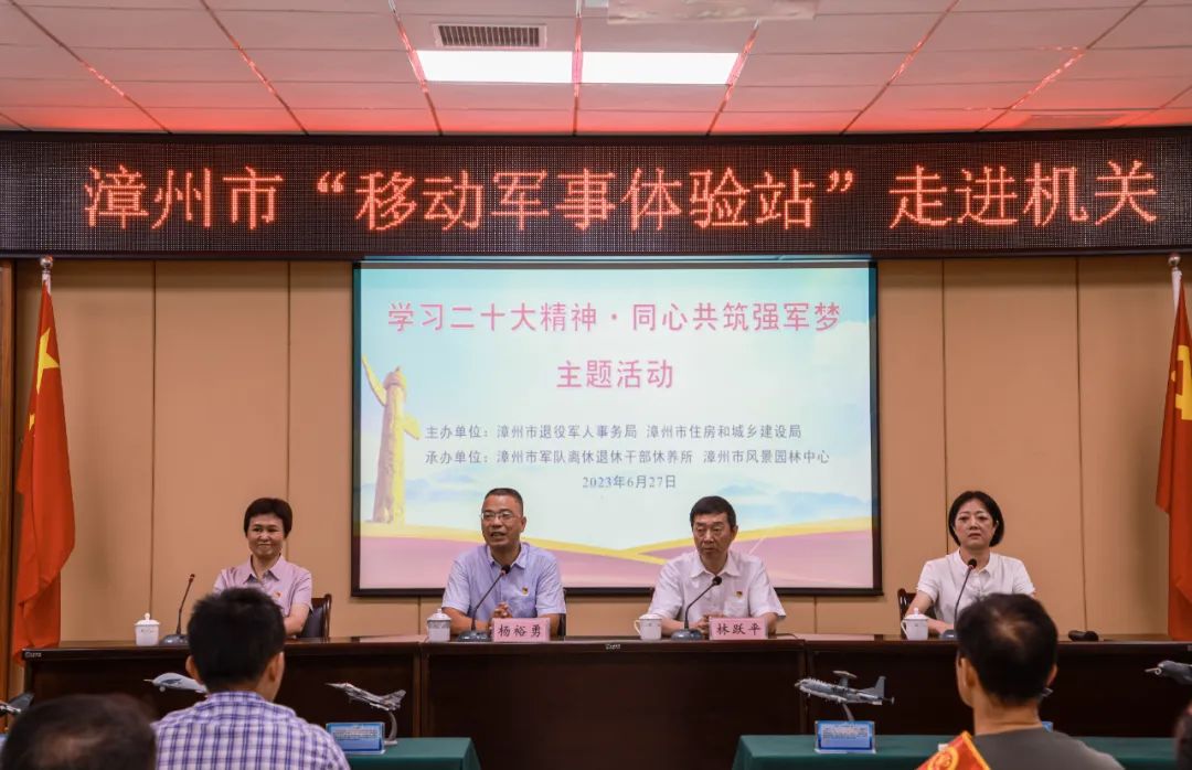 “学习二十大精神,同心共筑强军梦”。6月27日,漳州市“移动军事体验站”首次走进漳州市风景园林中心,面向机关干部职工开展国防教育。以此纪念延安双拥运动80周年,推动全民国防教育走深走实。漳州市住建局、漳州市风景园林中心50余人参加活动,漳州市退役军人事务局党组成员、副局长杨裕勇致词。