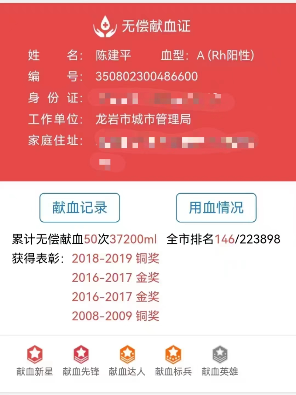 今年39岁的陈建平,原服役于上海市消防救援支队,是龙岩市新罗区南城街道莲滨社区居民。从武警消防战士到退伍老兵,他的热血依然滚烫,坚持无偿献血20年,累计3.72万毫升。