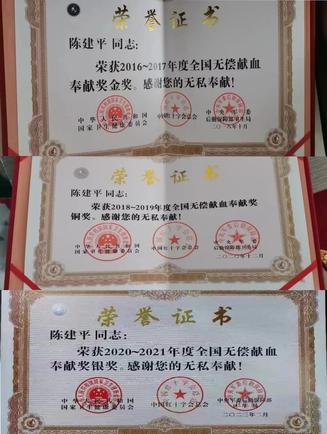 2003年,在一次消防救援任务中,有一名伤员因失血过多急需输血挽救生命,陈建平就萌生了献血的念头。作为一名消防战士,在人民群众需要的时候就应该勇敢站出来,他便开始第一次无偿献血,从此结下不解之缘。一次献血不难,难的是坚持。陈建平在无偿献血的路上坚持了20年,从未中断,累计献血50次,总计37200毫升。获中华人民共和国卫生健康委、中国红十字会总会、中央军委后勤保障部联合授予的2008-2009年度“全国无偿献血奉献奖铜奖”、2016-2017年度“全国无偿献血奉献奖金奖”、2018-2019年度“全国无偿献血奉献奖铜奖”、2020-2021年度“全国无偿献血奉献奖银奖”。