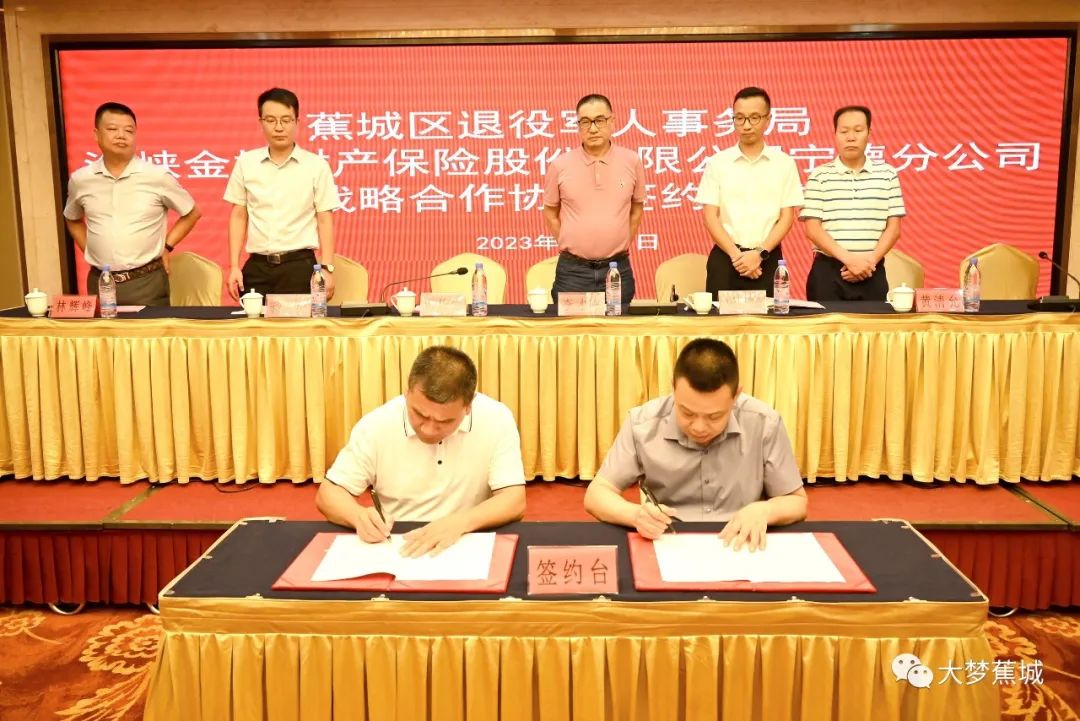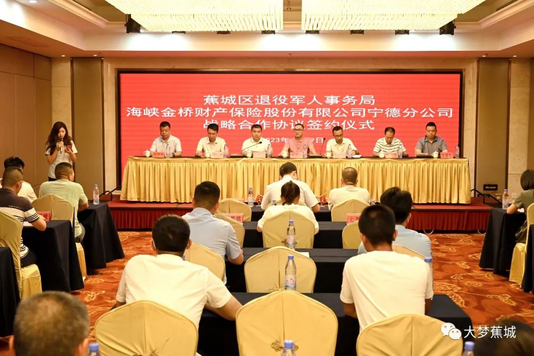 6月29日下午,宁德市蕉城区退役军人事务局与海峡金桥财产保险股份有限公司宁德分公司举行战略合作签约仪式。蕉城区政府副区长杨泰出席仪式。市、区退役军人事务局相关负责人,海峡金桥财产保险股份有限公司总公司、海峡金桥财产保险宁德分公司负责人及各乡镇(街道)退役军人服务站站长参加活动。