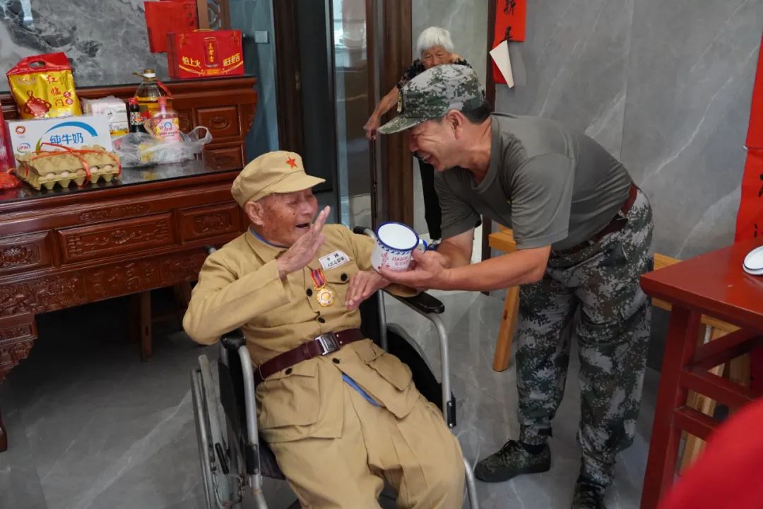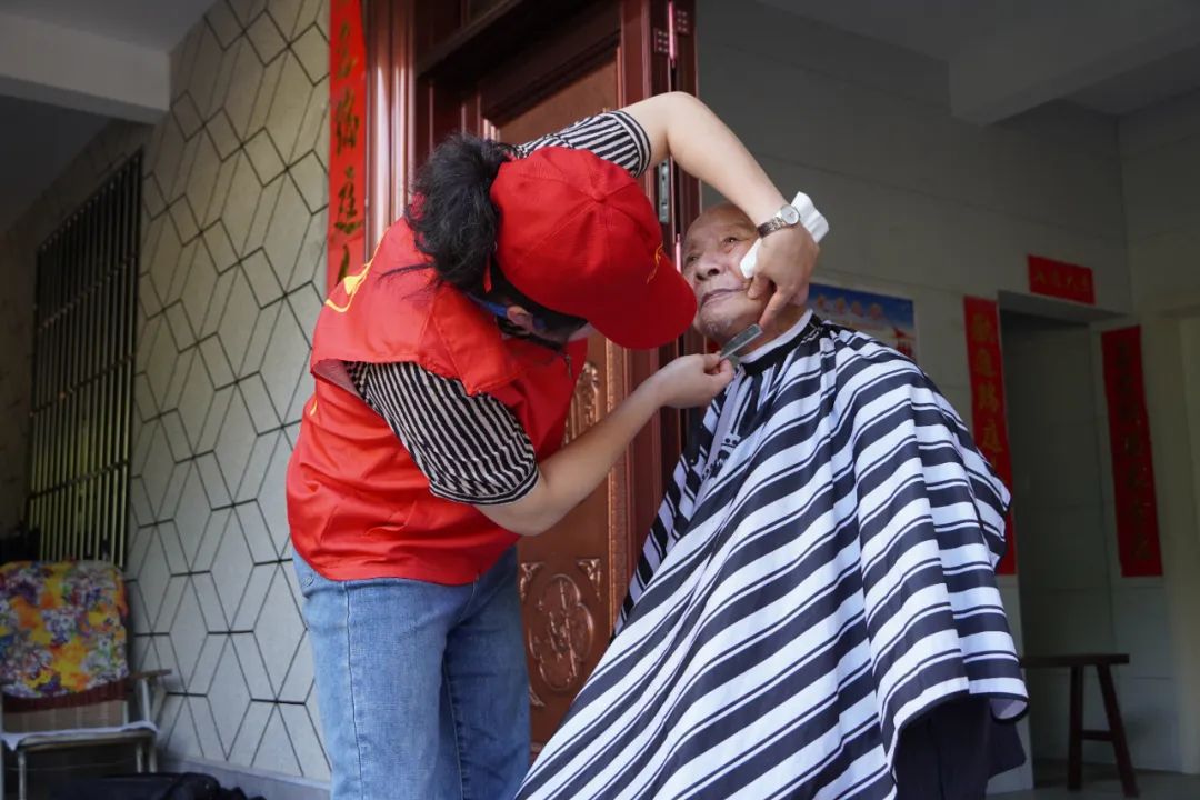 在台溪乡福廷坑村,志愿者还为90岁老兵林有枨提供了理发修面服务。“感谢大家还记得我,特意来看我、关心我,我真的很高兴。感谢党和政府,让我们过上了好日子。”林有枨在家人的搀扶下起身,向志愿者们敬起了军礼,以表达谢意。