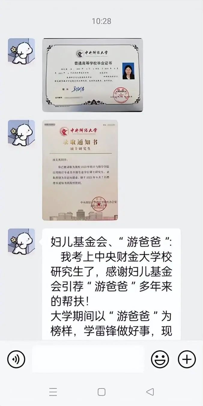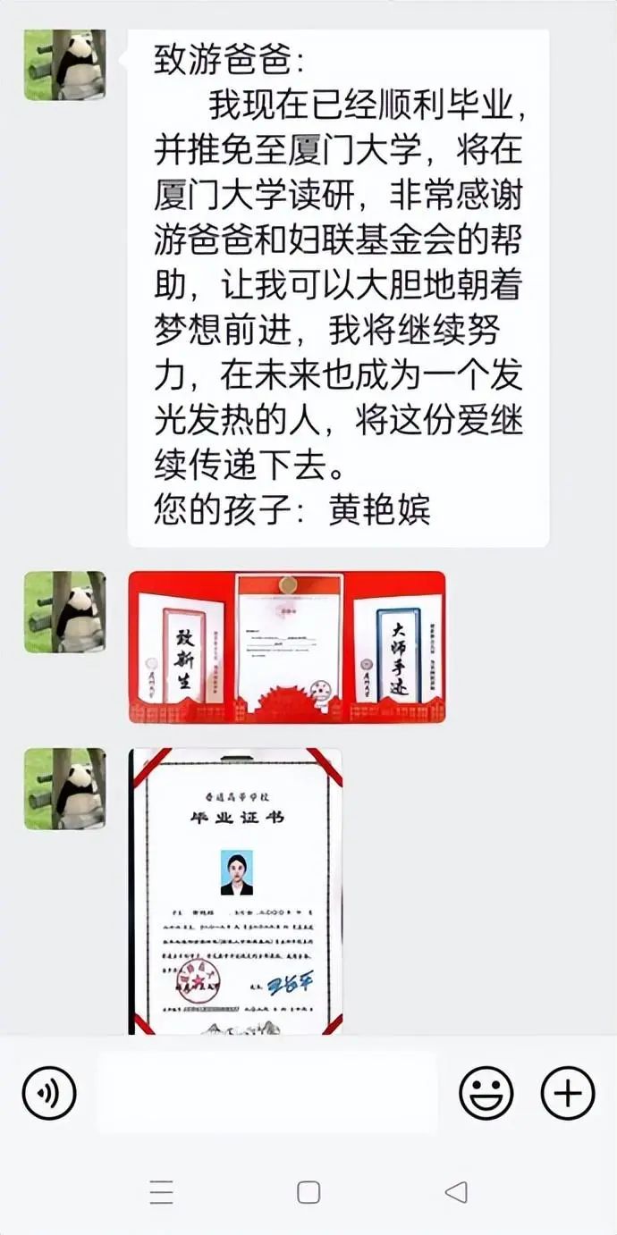 经他资助的汤爱英考上中央财经大学研究生,黄慧嫔收到厦门大学研究生录取通知书,章晓凤则被保送至华中师范大学读研究生……