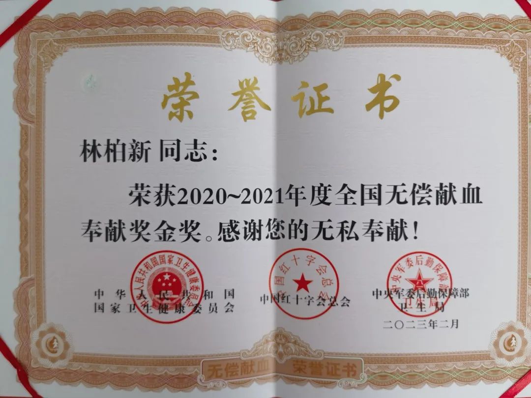 林柏新,从2014年开始献血,累计献血18900ml,获得全国无偿献血奉献奖金奖1次。