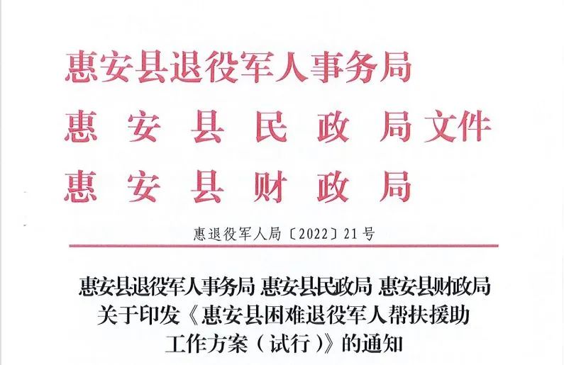 举措机制化。密切财政、民政、退役军人等部门之间的数据共享和沟通联系,汇聚各部门帮扶合力,实现对困难退役军人的集中帮扶。2022年9月,率先制定《惠安县困难退役军人帮扶援助工作方案》,并建立每月定期审核机制,实行一事一批,在保障退役军人享有公民普惠待遇的基础上,给予临时性、过渡性的帮扶援助。