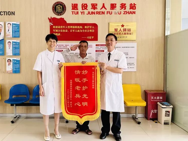 日前,65岁的老兵老林亲手将三面锦旗分别送到龙岩市退役军人事务局、连城县退役军人事务局和龙岩爱尔眼科医院,并激动地向负责人和医护人员敬礼致谢。