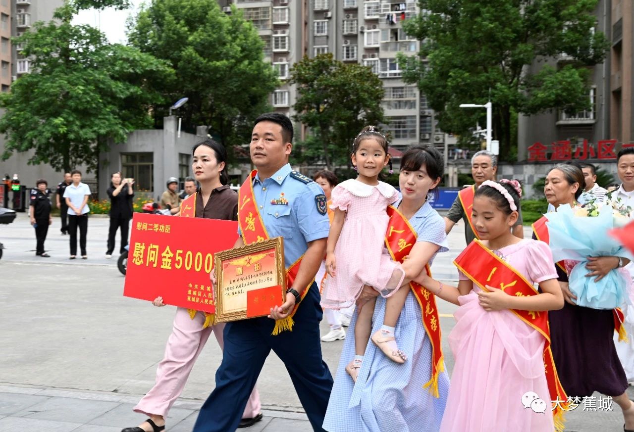 仪式上,林晓光、杨泰一行为王明涛与其家属佩戴上“一人立功,全家光荣”的绶带,并送上慰问金、立功喜报和鲜花,表达党和政府的关怀。