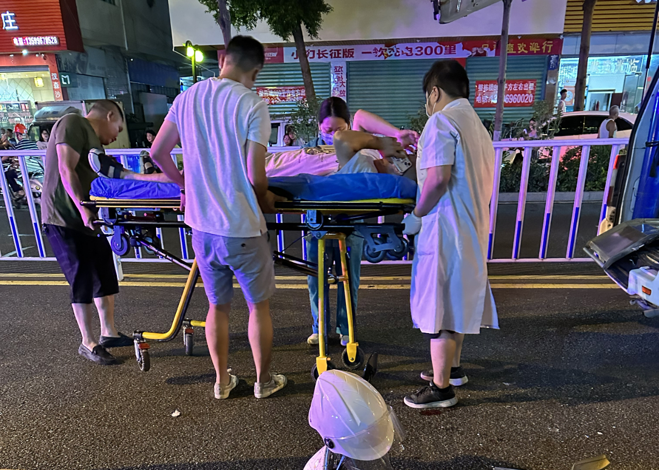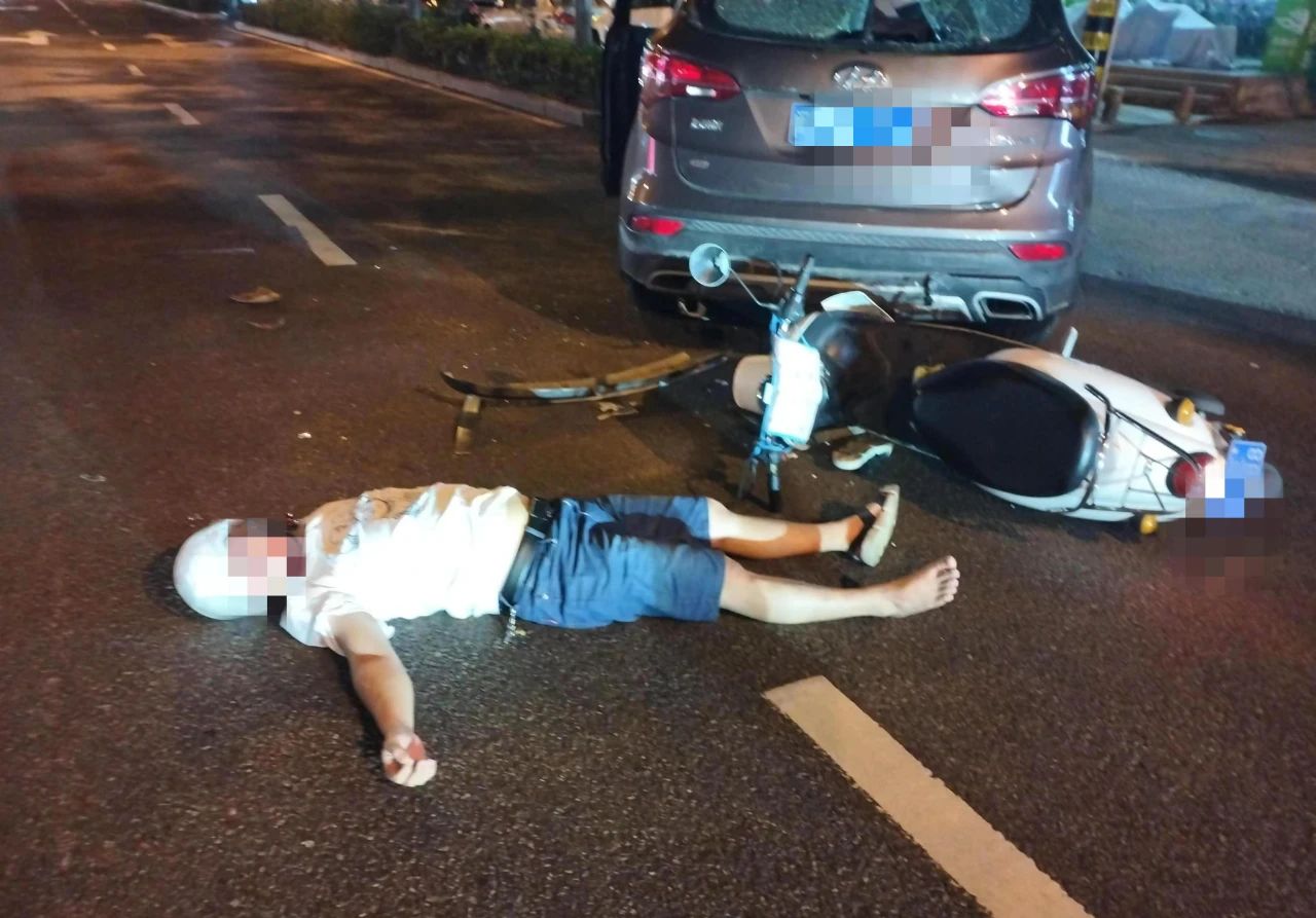 突然听到一声巨响,“砰”!军营练就的敏捷反应,促使蔡建钦和汪德全不约而同起身往外跑出察看。不好,可能出交通事故了!只见一部电动车倒横在北环路机动车道,旁边则是一个仰卧在机动车主干道戴着头盔一动不动的白衣男子,再侧边停着一部越野车,后档玻璃撞了一个足球大的窟窿,满地玻璃碎渣。
