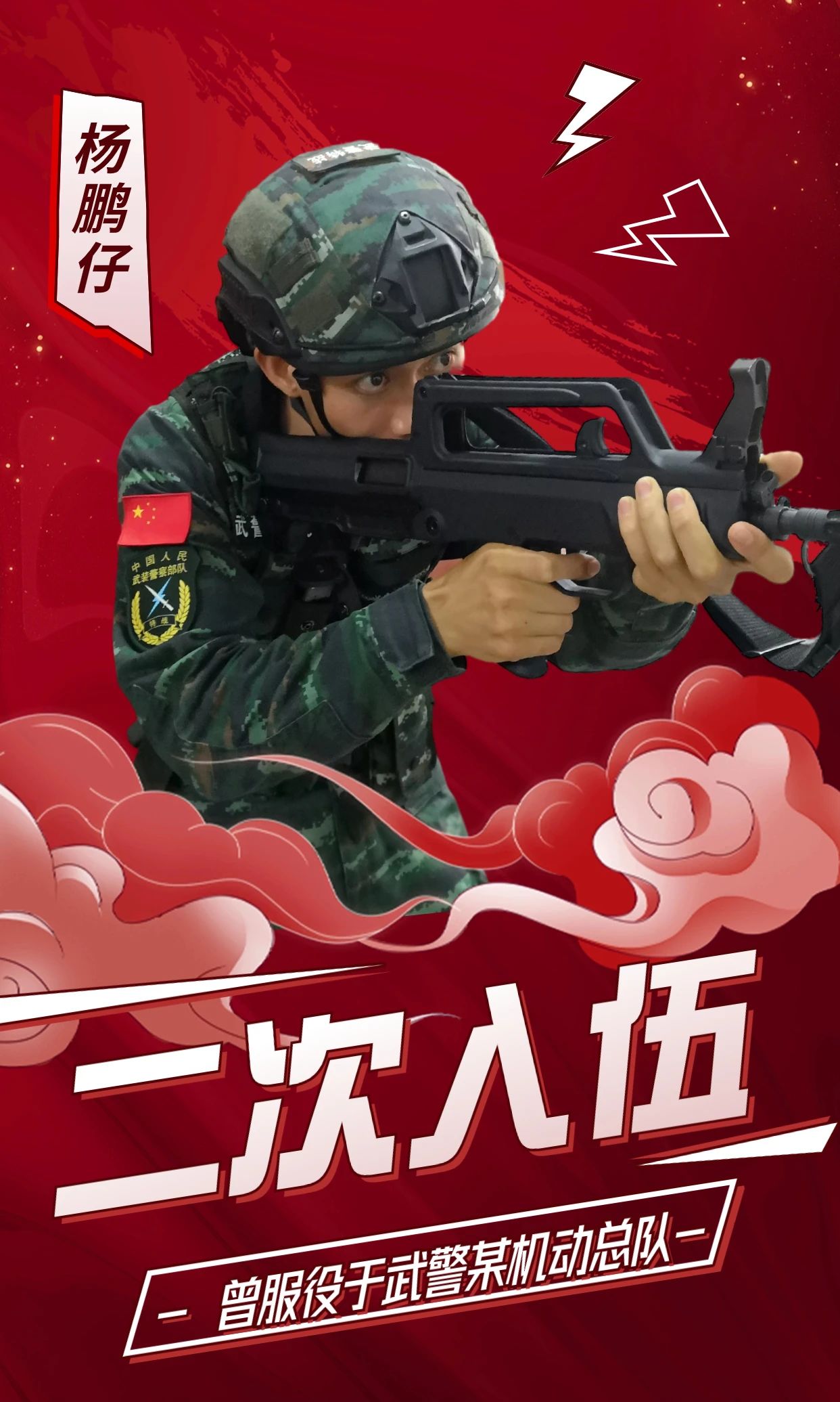 “如果说第一次入伍是因为对部队生活的憧憬和向往,那么第二次选择穿上军装,一定是因为对军营无法割舍的热爱。”2017年,刚满18岁的杨鹏仔第一次踏入了军营,刻苦训练、踏实工作,赢得了单位领导和战友们的好评,并在第三年争取到了去预备特战队员集训和第四年新训驾驶员集训锻炼的宝贵机会。