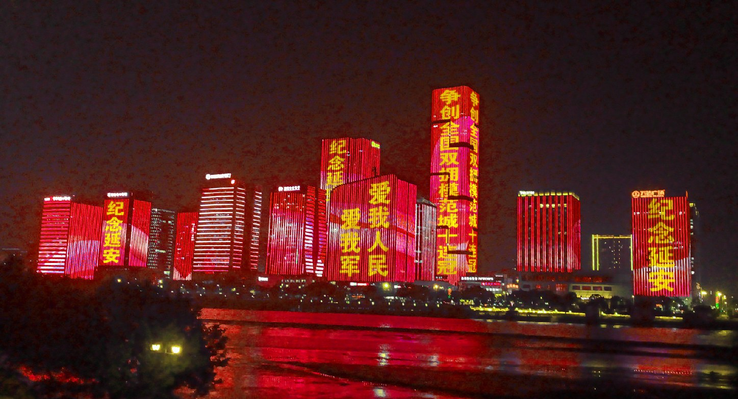八一期间,闽江海峡金融街商务区立面楼宇双拥主题灯光秀