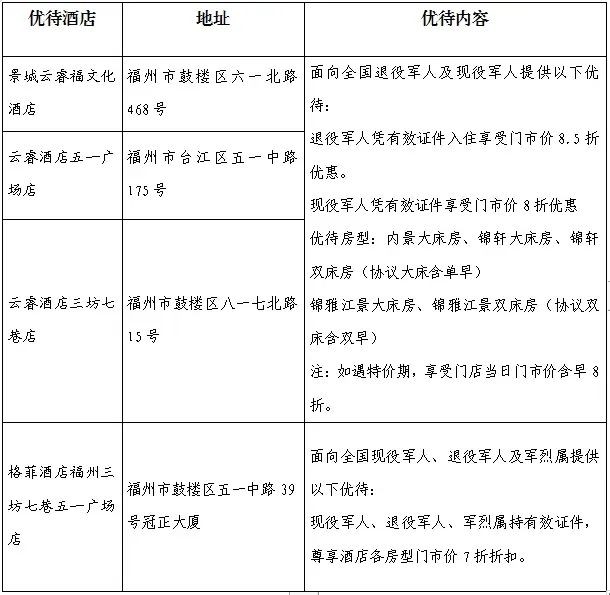 根据协议,福州星宸未来酒店管理有限公司旗下景城云睿福文化酒店、云睿酒店五一广场店、云睿酒店三坊七巷店,福州金星商务酒店有限责任公司(格菲酒店)将提供以下优待: