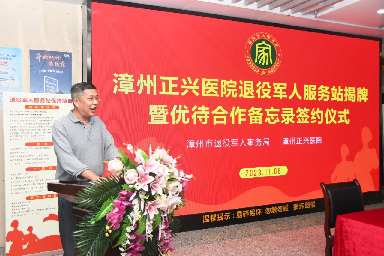 11月8日,由漳州市退役军人事务局与漳州正兴医院联合打造的正兴医院退役军人服务站正式成立,这也是漳州首家民营医院设立退役军人服务站。该站的成立是漳州市退役军人事务局深入开展主题教育,全面提升优待证功能,拓宽社会化拥军思路的实际举措,标志着漳州市在为老兵“办实事、解难题”上又向前迈出实质性一步。