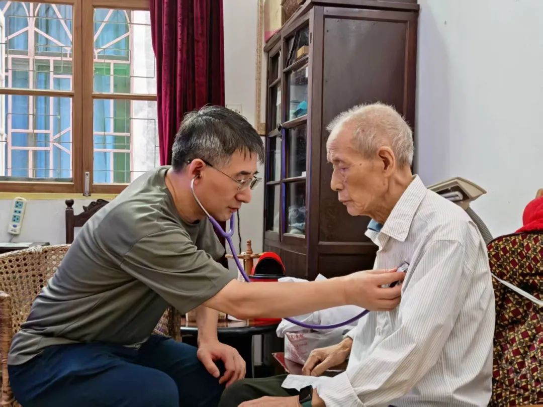 第900医院王建军副主任医师为抗战老兵谢斌详细体检、赠药并普及预防知识。