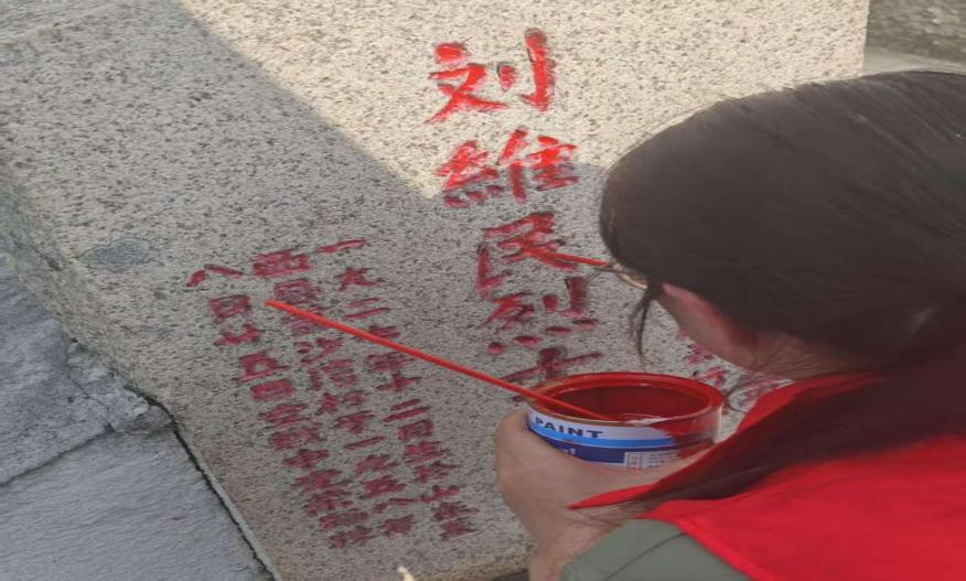 “丰碑守望者”队员为烈士墓碑描红