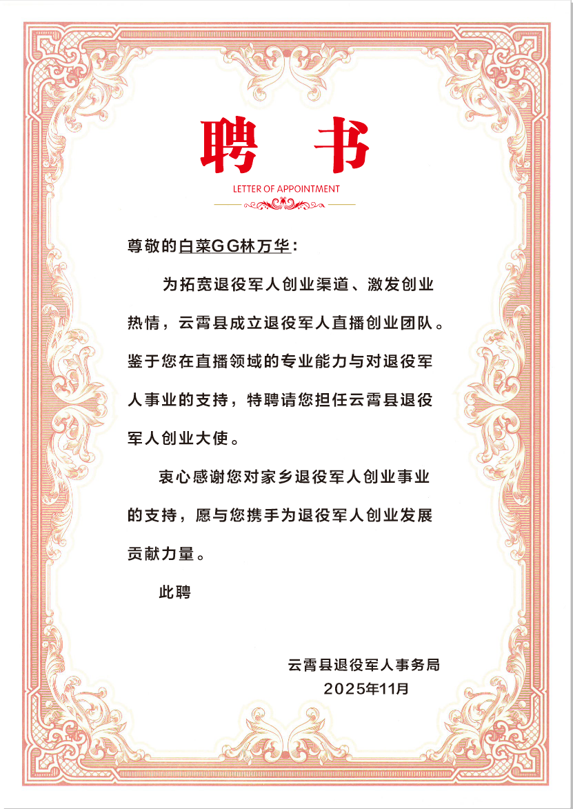 为进一步拓宽退役军人就业创业路径,结业仪式后,云霄县退役军人事务局精心策划了本次直播创业辅导活动,并做出一个重要决定:正式成立“退役军人直播创业团队”,同时聘任“白菜GG”林万华担任“云霄县退役军人创业大使”。在现场热烈的掌声中,聘任书被郑重递交,标志着一段全新的合作就此开启。