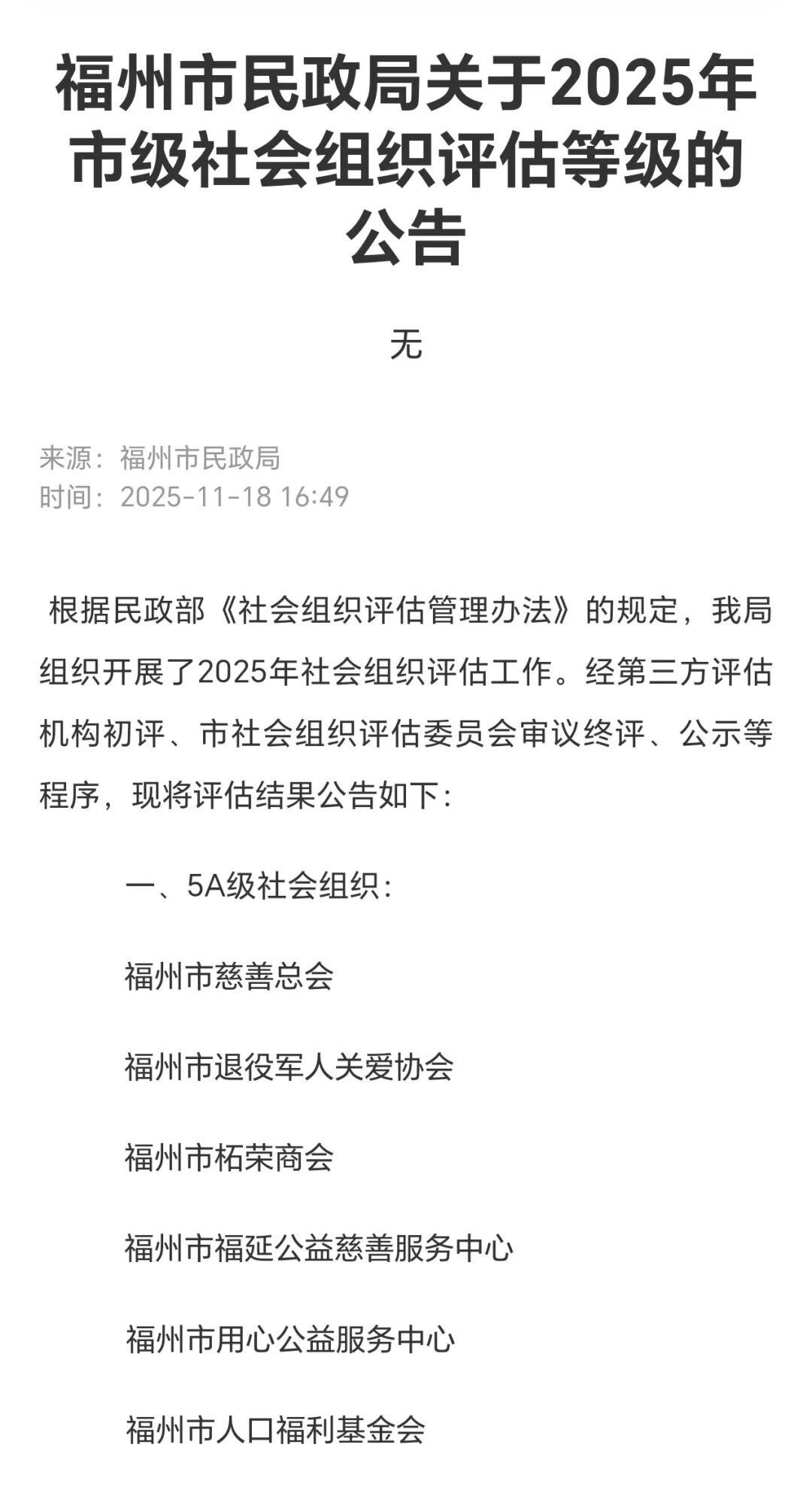 11月17日,福州市民政局正式发布公告,福州市退役军人关爱协会等六家单位成功获评AAAAA(5A)级社会组织称号。