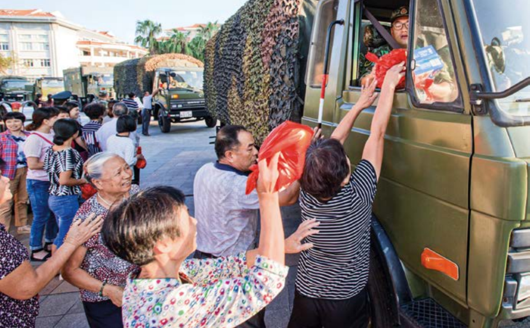 2016年中秋,超强台风“莫兰蒂”肆虐时,驻厦官兵化身救灾“突击队”“主力军”,连续奋战,特别是在受灾严重的鼓浪屿,创造了被广为赞誉的“厦门速度”。台风过后,一队救灾官兵执行道路清障任务时,把挎包整齐地放在路边就立刻前去清障,直到下午任务结束归队才发现,每名官兵的挎包上都放着一个寓意平安的红色福袋,每个袋子里装着2颗红鸡蛋。福袋上留下的文字令人动容——“当灾难来临的时候,我看到一个个穿着迷彩服的身影,我知道那是我们的人民子弟兵。”2023年7月,在防抗台风“杜苏芮”的战斗中,第73集团军作为首拨救援力量,出动官兵3000余人、车辆360余部,第一时间逆风而行,进入受灾最严重的区域参与救援。