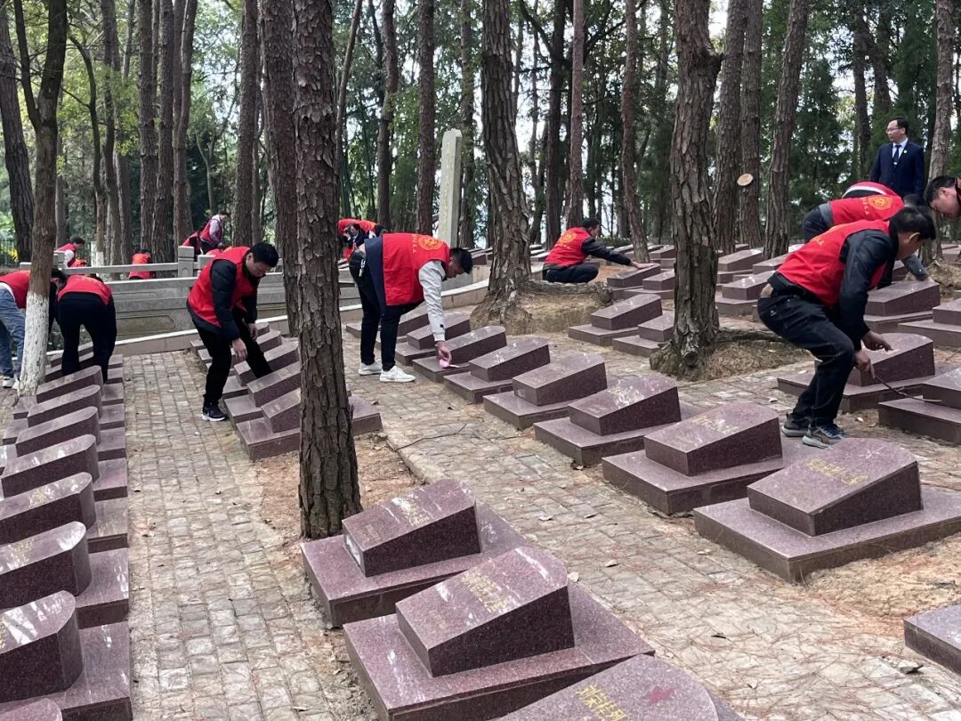 默哀仪式后,在工作人员的带领下,社区矫正对象手持毛巾,轻轻擦拭烈士墓碑。他们俯下身,细致地拂去墓碑上的尘土,清理周边的落叶杂草。