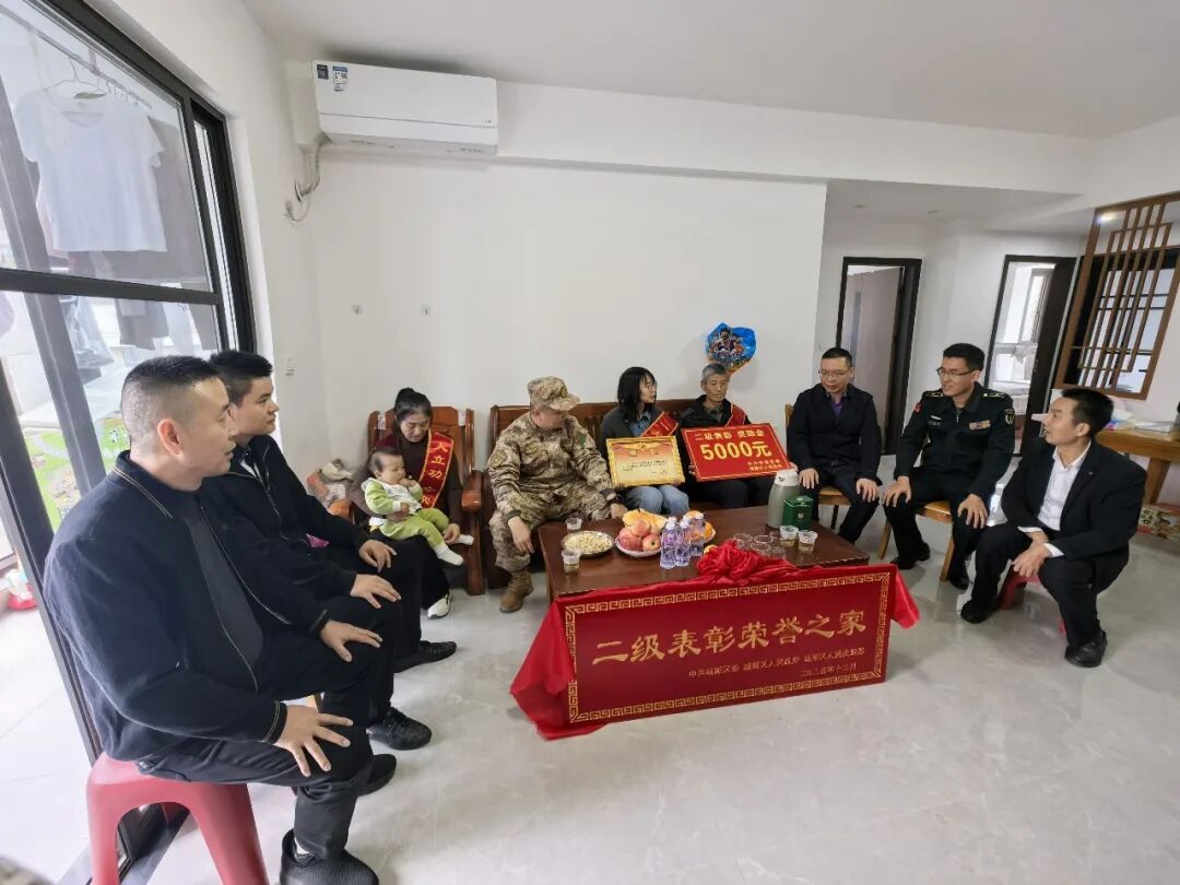 慰问组工作人员为家属佩戴绶带、送上立功喜报、功勋牌匾和慰问金,与家属亲切交流,详细询问他们的生活、健康状况及实际需求,并对符涛取得的成绩致以热烈祝贺,感谢其家庭为国家和部队培育优秀人才。同时表示,若遇到困难,请及时与我们沟通,相关部门将持续做好保障,切实消除军人后顾之忧,鼓励符涛在军营安心服役、再立新功。