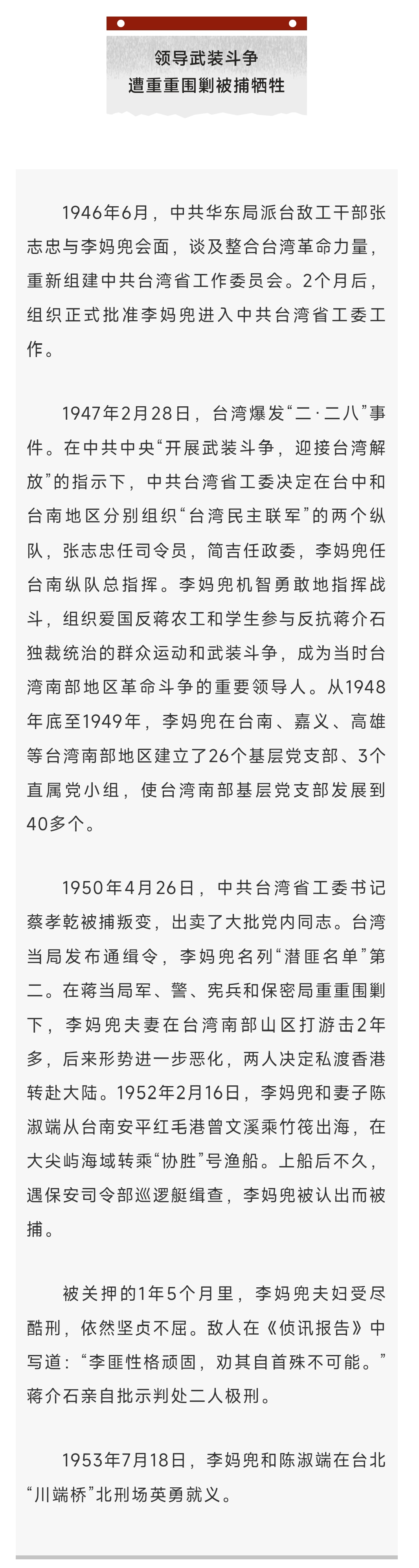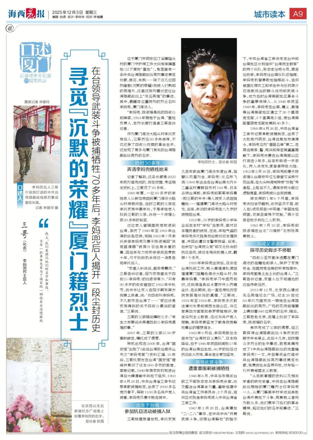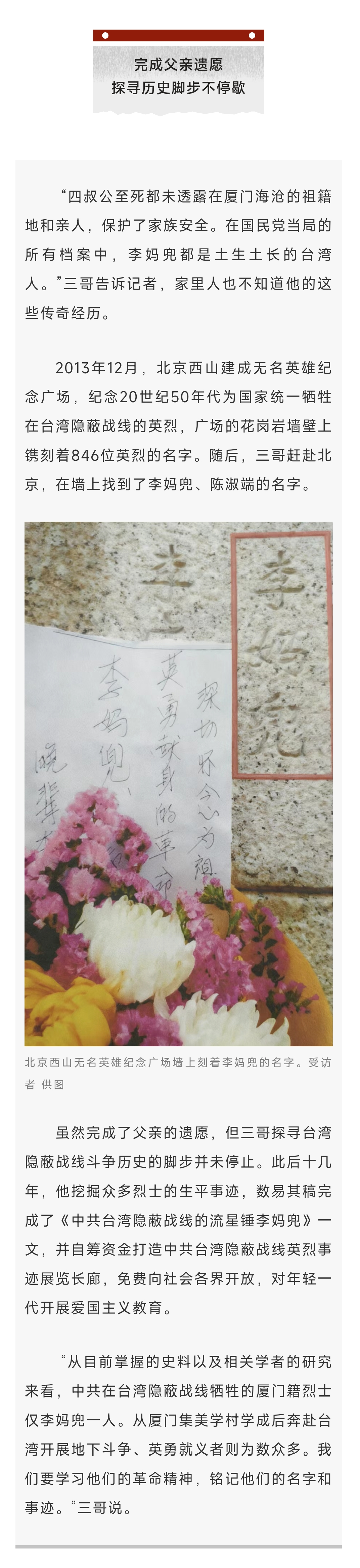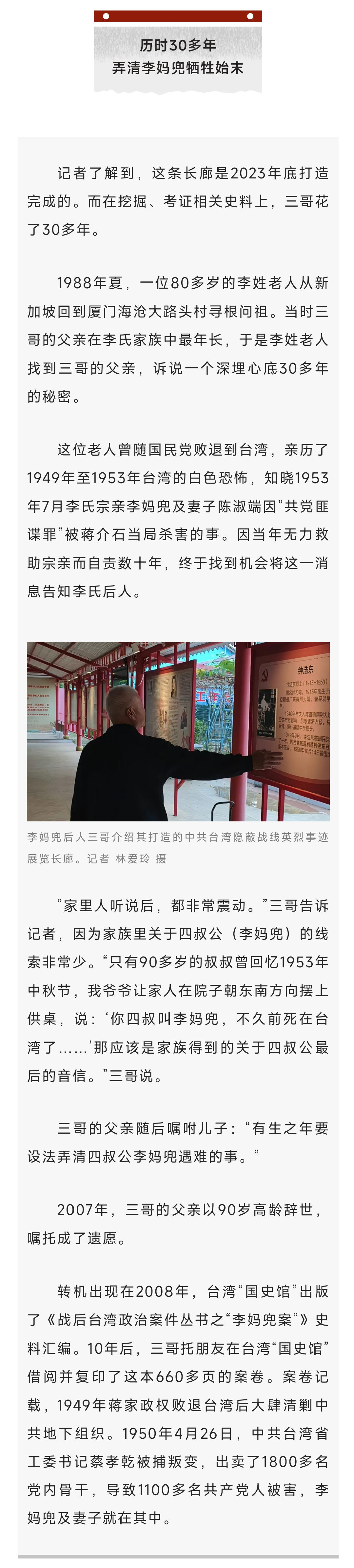 “李妈兜、陈淑端是我的四叔公和婶婆,1953年牺牲于台湾。”基地负责人、忠烈长廊打造者三哥告诉记者。