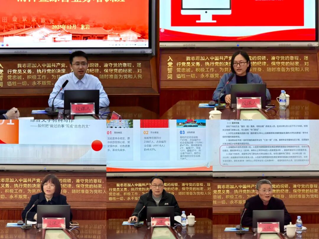 为深入学习贯彻党的二十届四中全会精神,进一步提升全市退役军人事务系统工作人员能力素质和业务水平,12月19日,龙岩市退役军人事务局通过视频形式举办全市系统学习贯彻党的二十届四中全会精神暨综合业务培训班,市退役军人事务局党组书记、局长张华玉等市局领导,各县(市、区)退役军人事务局局长参加,培训对象覆盖市、县、乡三级退役军人事务系统全体干部职工。