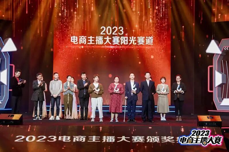 陈金华(右四)获得全省“2023电商主播大赛·阳光赛道”冠军高丽平摄