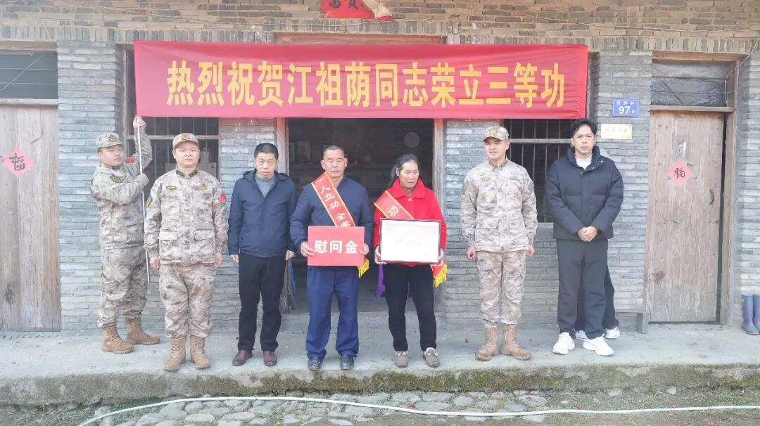 12月26日,三明市明溪县城关乡、盖洋镇锣鼓喧天、鞭炮齐鸣,由县人武部、县民政和人力资源社会保障局(县退役军人事务局)组成的送喜报队伍,深入城关乡坪埠村,盖洋镇盖洋村、杨地村、常坪村,为4户荣立三等功的现役军人家庭送去立功喜报,让军人军属共享荣耀时刻,在全县营造“一人立功、全家光荣”的浓厚氛围。