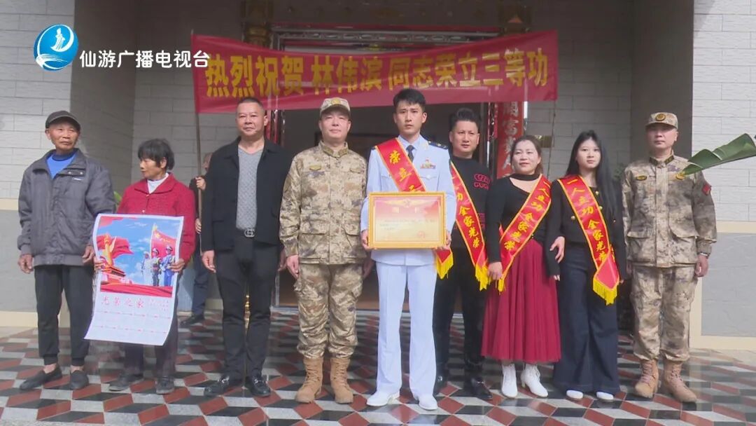 近日,莆田市仙游县人武部、县退役军人事务局及属地政府组成联合慰问组,在一片敲锣打鼓声中将“三等功”喜报送至现役军人林伟滨家中。