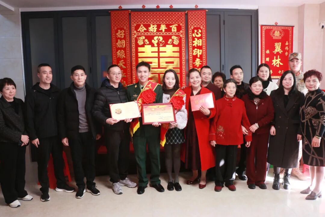 1月19日,福清市退役军人事务局、市人武部等军地领导为林嘉伟送上一份特殊的“新婚礼物”——他荣立个人三等功的喜报。现场,福清市退役军人事务局、市人武部等军地领导为林嘉伟披挂上绶带,并送上喜报和慰问金。据悉,三天前,林嘉伟举行了新婚典礼,家门口的喜庆装饰尚未撤去,此刻又增添了功勋的荣耀。