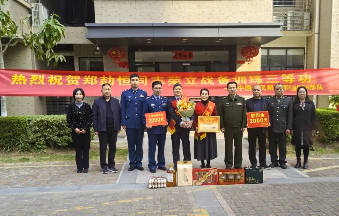 1月19日上午,龙岩市新罗区委常委、人武部政委曾招锦,区退役军人事务局局长谢朝举,曹溪街道党工委书记曹文柏及部队、社区代表共同为荣立“三等功”现役军人郑劼恒家庭送上喜报及暖心关怀。