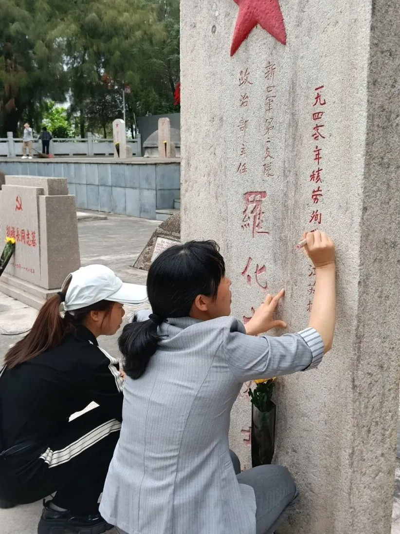仪式结束后,全体队员怀着对革命先烈的崇敬与缅怀之情,前往上杭县烈士陵园开展主题祭扫活动。陵园内松柏苍翠、庄严肃穆,队员们依次敬献鲜花,寄托追思;随后手持工具,认真清理墓园杂草、清扫落叶,细致擦拭每一块墓碑;在墓碑描红环节,大家凝神静气,一笔一划为碑文描红,让字迹重焕鲜红,以实际行动守护先烈英名、传承革命精神,也接受了一场深刻的红色爱国主义教育。