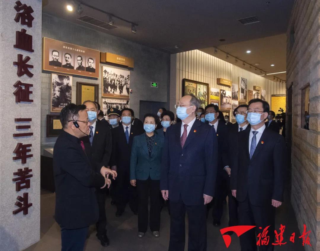 位于福州鼓山脚下的省革命历史纪念馆,在阳光下格外庄严肃穆。尹力、王宁、崔玉英等省领导来到这里,走进“红色福建主题展”。主题展分为“饱经忧患不屈抗争”“国共合作唤醒工农”“土地革命创建苏区”“浴血长征三年苦斗”“团结御侮奋勇抗敌”“壮大力量迎接解放”6个部分,生动展示了福建自1840年鸦片战争到1949年新中国成立的百年历史风云。在工作人员的讲解中,一件件珍贵的历史文物,逼真的历史场景还原,详实的图片和资料,深深吸引了大家的目光,对福建人民在中国共产党领导下进行革命斗争的光辉历程感慨良多。