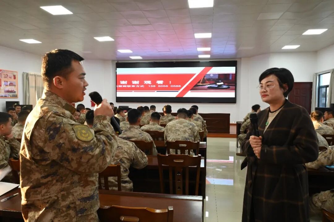 交流环节气氛热烈,官兵提问涵盖自身、亲友及身边案例,吴律师结合案例与法条,一一细致解答,引导官兵思考军恋军婚中可能面临的法律与情感双重挑战,并传授依法维权的思路与方法。