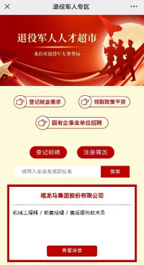 同时,龙岩市退役军人事务局还积极搭建“退役军人人才超市”,共有106家企业入驻,提供了2237个岗位,为退役军人求职就业提供更加有力、更加便捷的线上服务。关注“龙岩市退役军人事务局”微信公众号后即可直接使用。