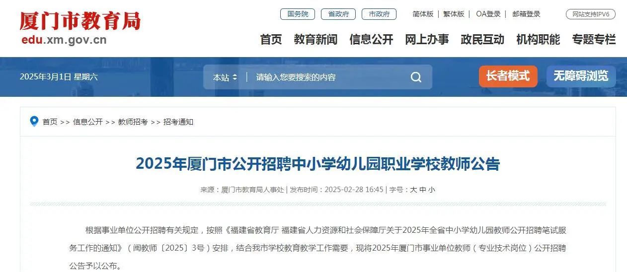 此次招聘再次设立退役军人专岗,总共20个。符合中小学教学岗位条件、厦门市户籍或厦门市接收安置的自主就业退役士兵或复员干部可报考。