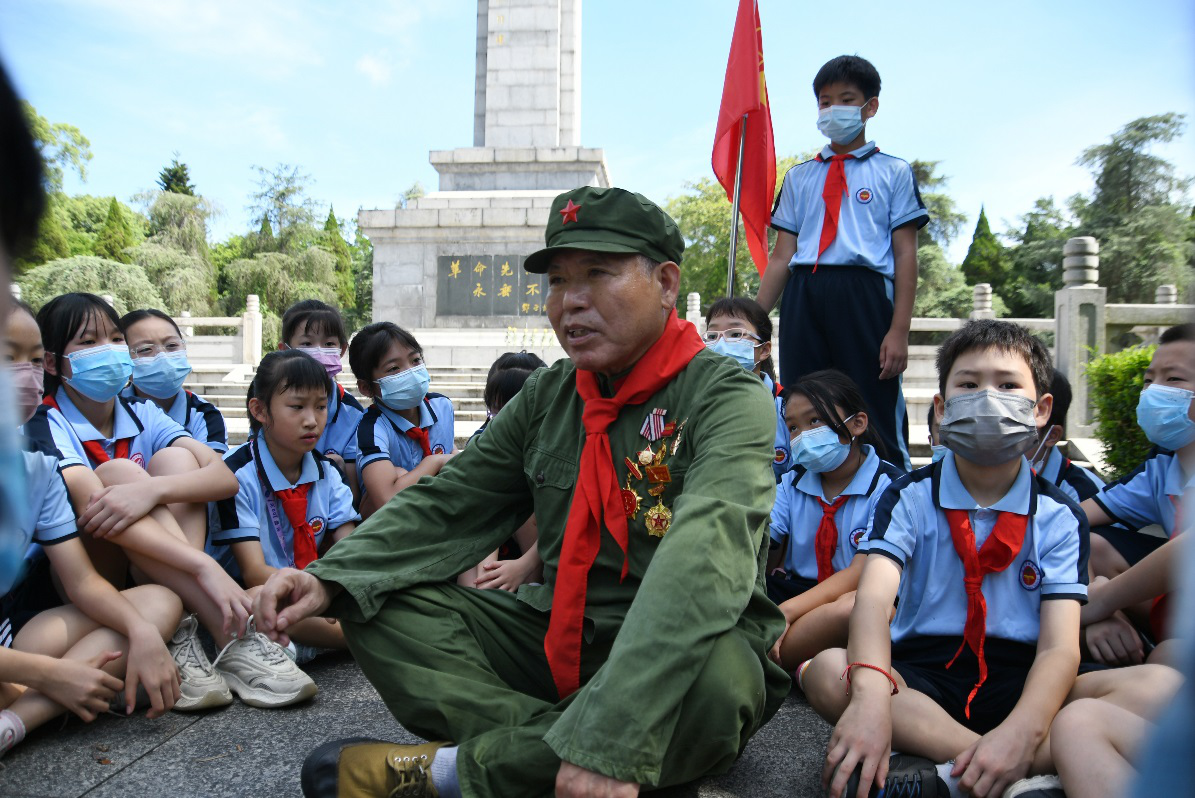 2022年8月,龙岩市各中小学校把开学第一课的课堂搬到各烈士纪念设施场所,开展爱国主义教育。图为参战老兵林国才为少先队员讲述战斗经历