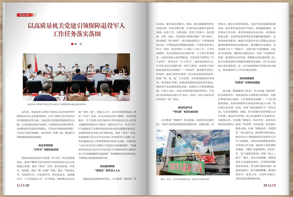 大力推进“堡垒型”机关建设,重点抓领导干部“关键少数”和青年干部“关键队伍”,引领基层党组织全面进步、全面过硬。建设“四强”支部,扎实开展“党员志愿服务”“廉政微党课”“一支部一品牌”“季度督促检查”“入党纪念日谈心、赠书”等活动,推动支部“达标创星”;结合迎“七一”活动,表彰先进典型,激发干事创业内生动力。搭建交流平台,举办50期“军民情”讲坛,选派5人次参加省直机关青年学习讲堂,与省委省直机关工委、驻闽部队、省直有关部门联合开展主题党日活动,交流学习体会、促进共同成长。创新工作载体,深入开展“我与老兵面对面”“烈士亲友讲烈士故事”等宣讲活动,推动党史军史飞入寻常百姓家,赢得社会各界广泛好评;组织5期67人次“根在基层”青年干部蹲点调研,促进向下扎根、向上生长。省退役军人事务厅《深化党史学习教育成果创新“我为老兵办实事”机制》获全省机关体制机制创新案例三等奖。