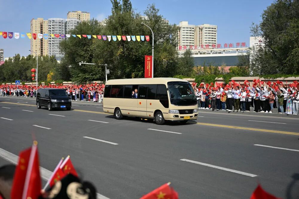 乌鲁木齐市充满节日的喜庆氛围。从机场到住地沿途主要街道两旁花团锦簇、彩旗飘扬,各族群众手持红旗,齐声欢呼,表达欢迎和感激之情。习近平向沿途群众频频挥手、亲切致意。