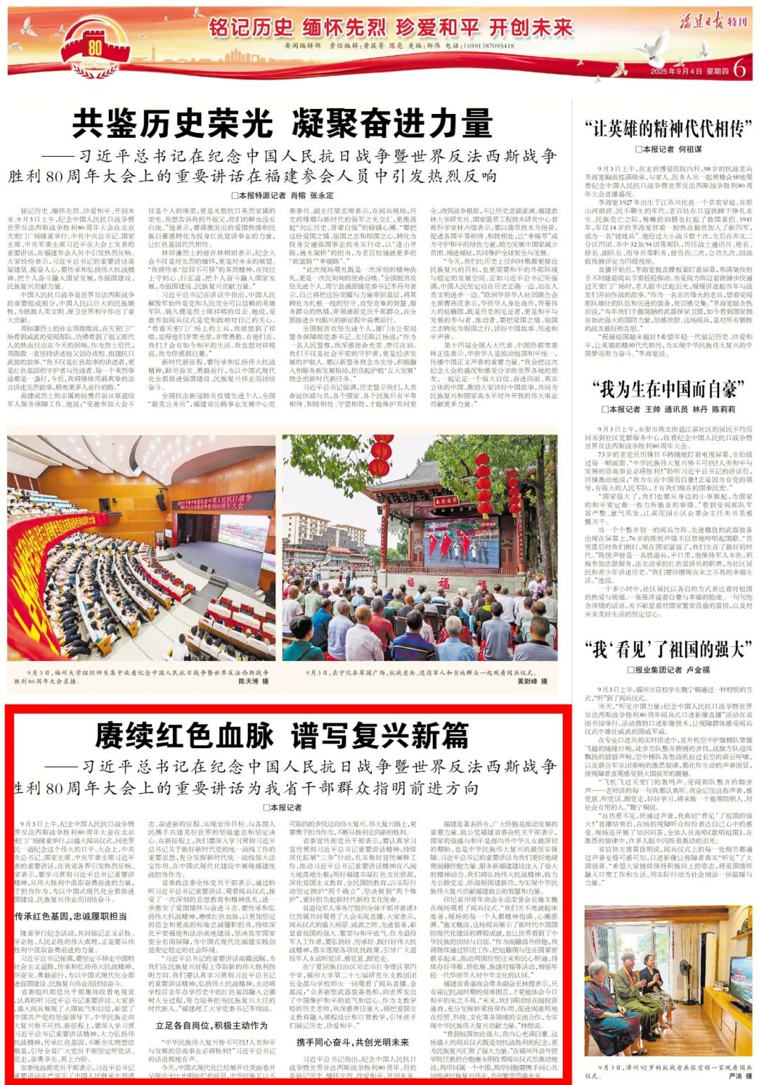 9月3日上午,纪念中国人民抗日战争暨世界反法西斯战争胜利80周年大会在北京天安门广场隆重举行,以盛大阅兵仪式,同世界人民一道纪念这个伟大的日子。大会上,中共中央总书记、国家主席、中央军委主席习近平发表的重要讲话,在我省各界引发热烈反响。大家表示,要学习贯彻习近平总书记重要讲话精神,从伟大胜利中汲取奋勇前进的力量,勇于担当作为,为以中国式现代化全面推进强国建设、民族复兴伟业而团结奋斗。