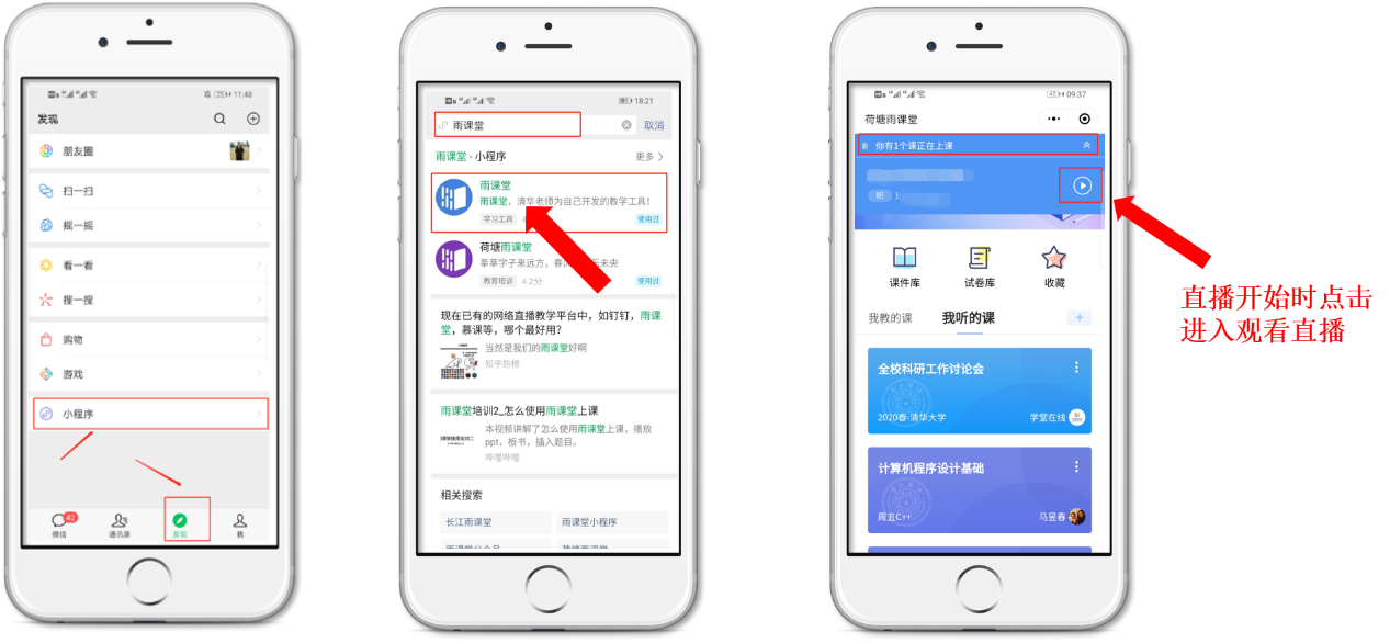 在微信搜索进入【雨课堂】小程序,直播开始时在小程序页面上面有“你有一个课正在上课”的提醒,点击进入观看直播。