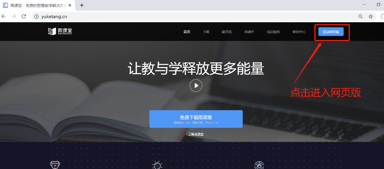 通过浏览器进入雨课堂网页版(https://www.yuketang.cn),点击右上角【登录网页版】,如图6所示。