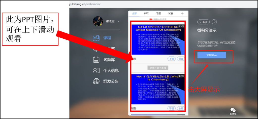 进入课程观看页面后,按照图7的箭头指示点击进入当前直播页面,选择【进入大屏显示】,如图8所示,即可进入大屏直播页面,如图9所示。建议:图8网页和图9网页最好只保留一个网页,否则可能出现两个网页同时直播声音干扰的情况。