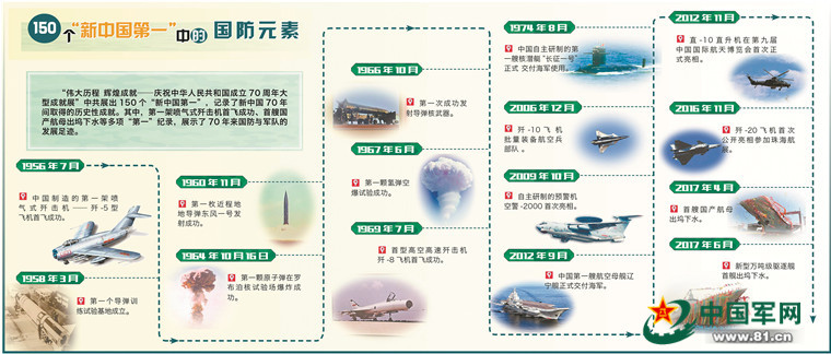 令人瞩目的是,此次展览评选出150个“新中国第一”。其中,新中国第一架喷气式歼击机首飞成功、第一颗原子弹爆炸成功、第一艘自主研制的核潜艇正式交付海军、第一艘国产航母出坞下水……那些难忘的“第一”标定了70年国防科技发展的坚实足迹。