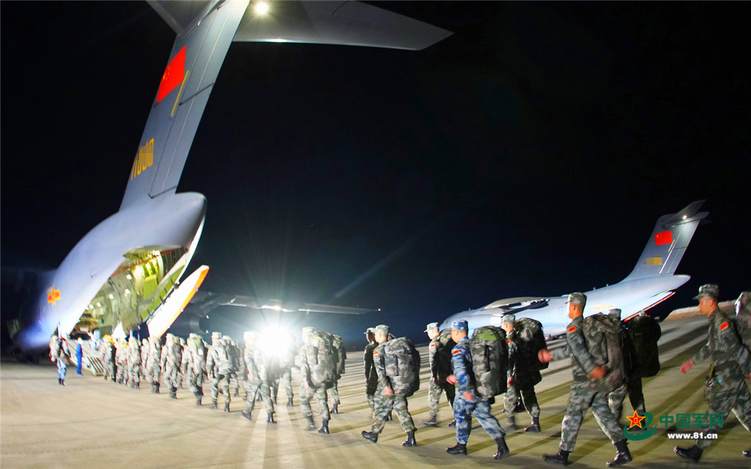 中方参演部队第二梯队人员星夜出征,正在组织登机。