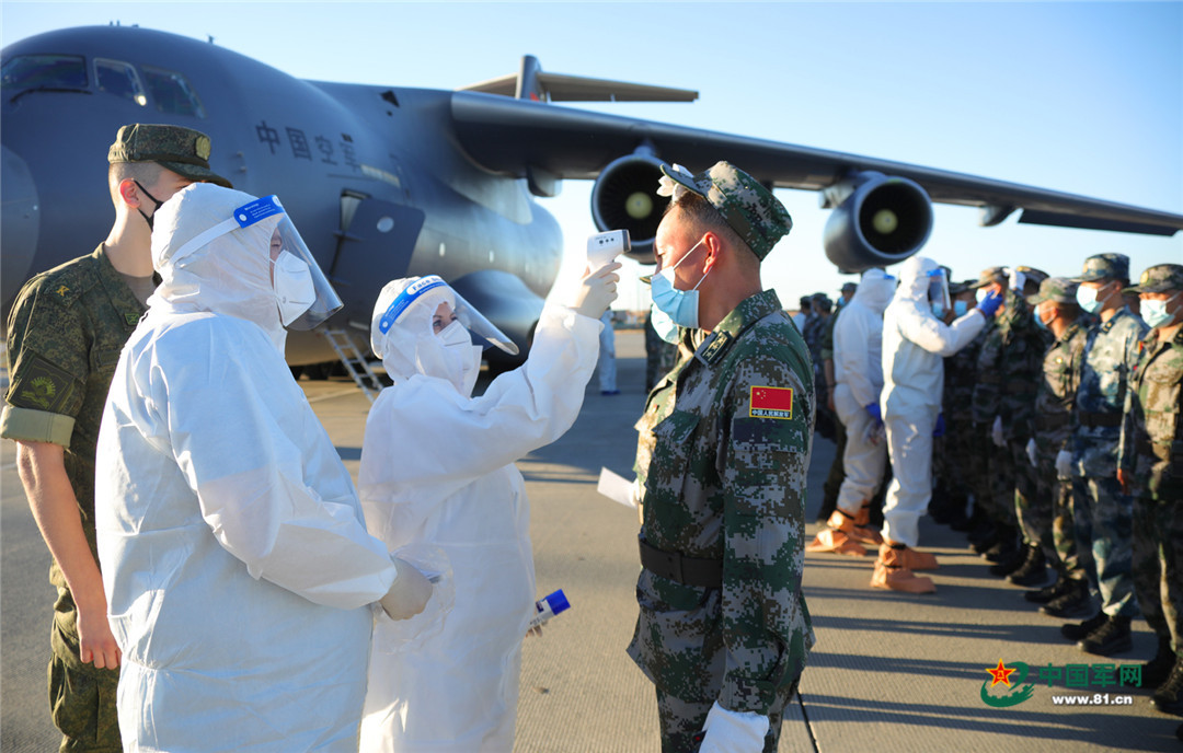 在俄方机场,我参演官兵整齐列队,接受俄方通关检查,俄方防疫人员为我参演官兵测量体温、发放中俄双语版防疫信息提示卡。出于疫情防控需要,中方参演官兵全程佩戴口罩。