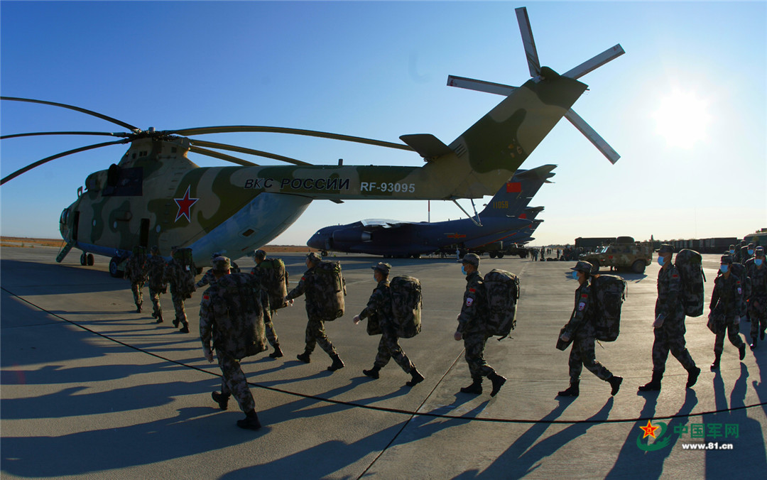 中方参演官兵乘坐俄军米-26直升机向卡普斯京·亚尔靶场转场。