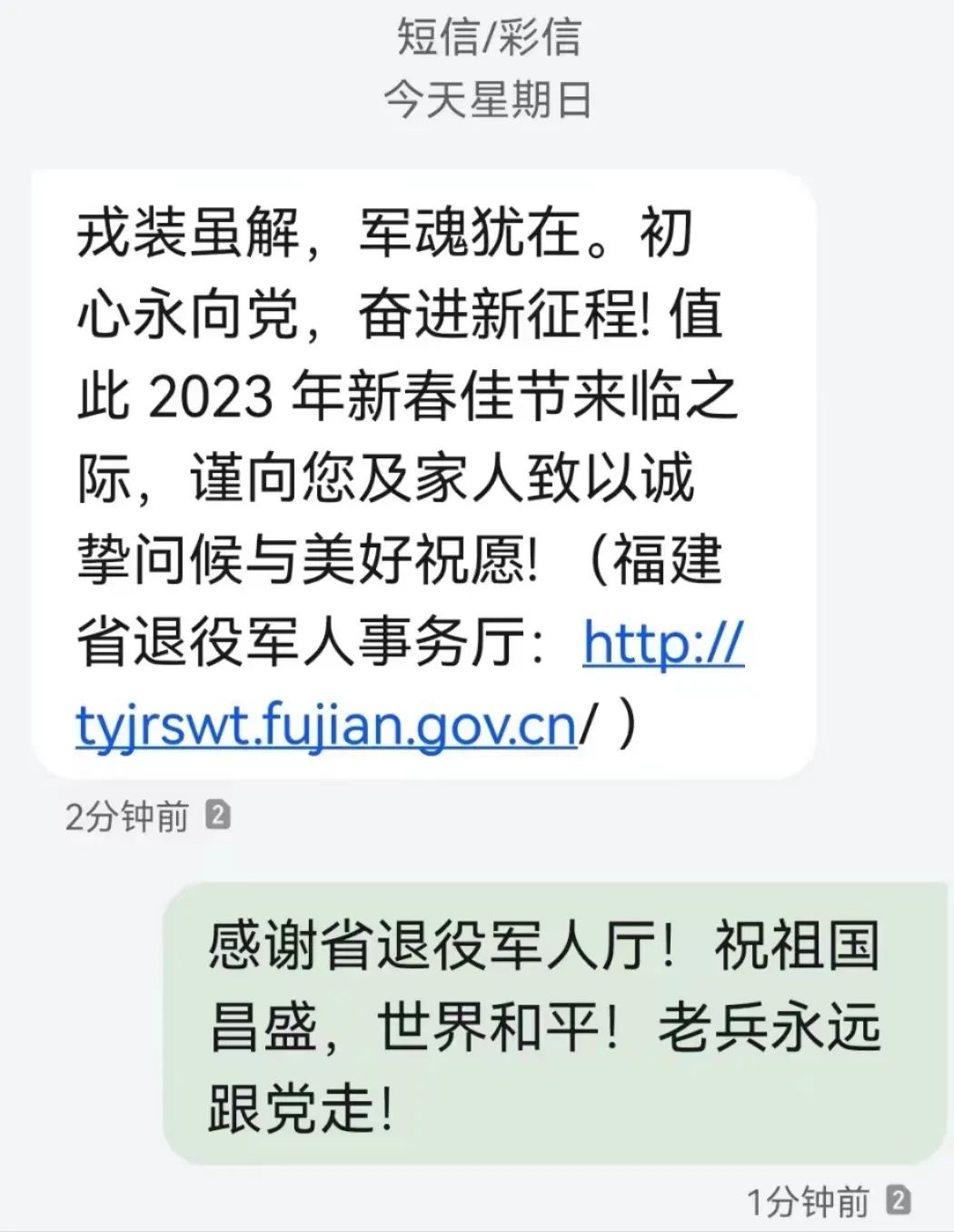 “戎装虽解,军魂犹在。初心永向党,奋进新征程!值此2023年新春佳节来临之际,谨向您及家人致以诚挚问候与美好祝愿!(福建省退役军人事务厅:http://tyjrswt.fujian.gov.cn/)”