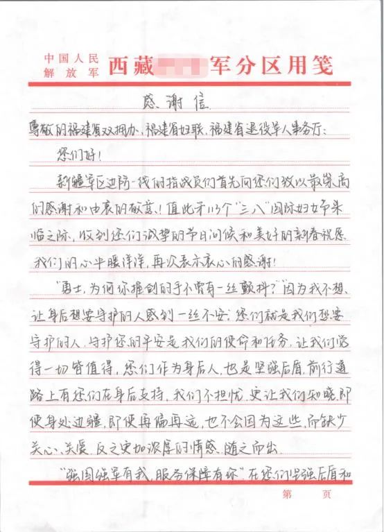 她们在感谢信中说道:“守卫边疆是我们的使命和任务!前行道路上有您们在身后支持,让我们觉得一切都值得。”