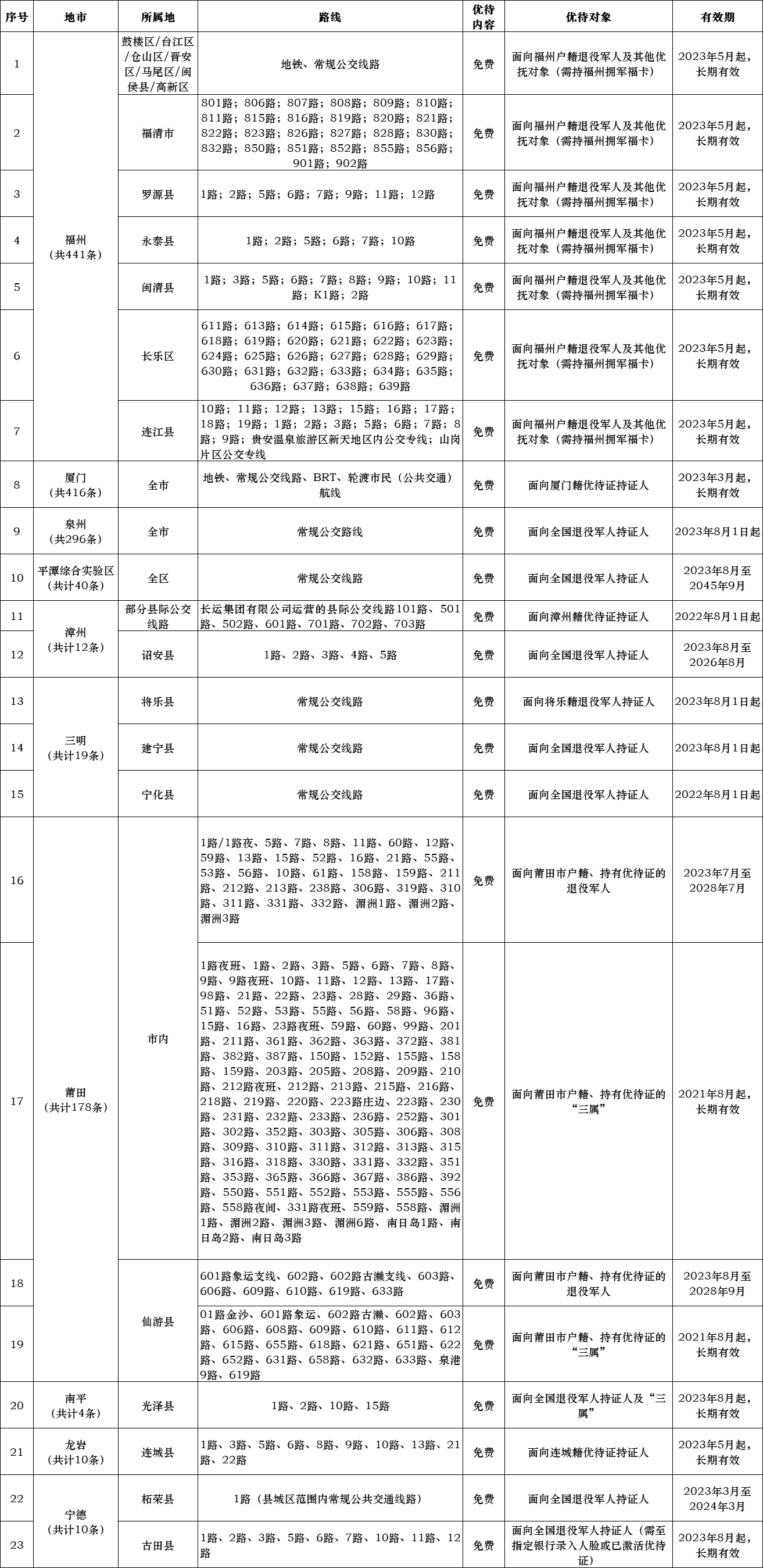 继我省63家A级景区推出优待证减免门票政策后,全省又有54个市县(区)陆续推出1426条公共交通路线供优待证持证人免费乘坐。其中,福州、厦门、泉州、平潭等4地,可免费乘坐辖区内所有常规公共交通线路,其他地区也推出部分免费线路。让我们看看具体哪些公共交通线路可供免费乘坐。