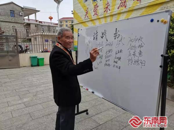 2月2日下午,泉港区山腰街道锦塔社区村部外的广场上,一位88岁的老人领着一群年轻人,面对鲜红的党旗,举起右手坚定地表达自己的决心:“我是一名老兵,自愿带领我的子女一起抗击疫情。”