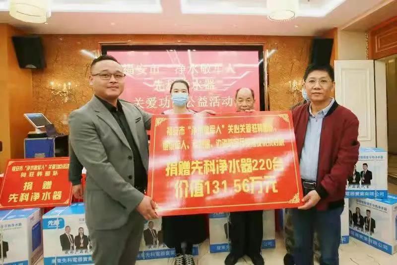 10月28日,福安市双拥办、福安市军民融合促进会与先科电器有限公司在会展酒店开展“净水敬军人”关爱功臣公益活动,向福安的退役军人、军烈属、驻韩部队、边海防官兵家庭及优抚对象捐赠净水器220台,价值131.56万元。